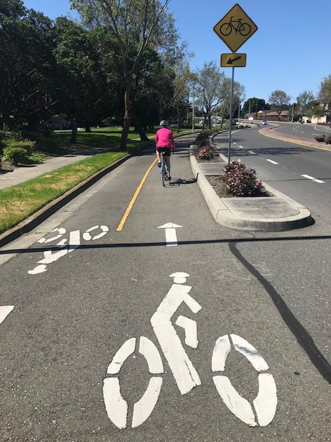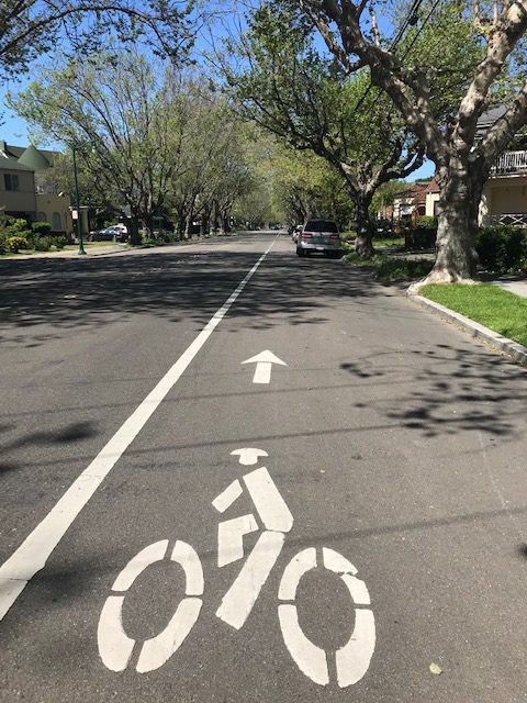 d. Class IV Bike Lane is a “buffered” lane (also known as a cycle track)–meaning there is a physical barrier between the bicyclist and vehicles. It can be one-way or two-way and is the BEST solution to safe streets. You’ll find one on Fernside, and soon, we hope, on Central Avenue.