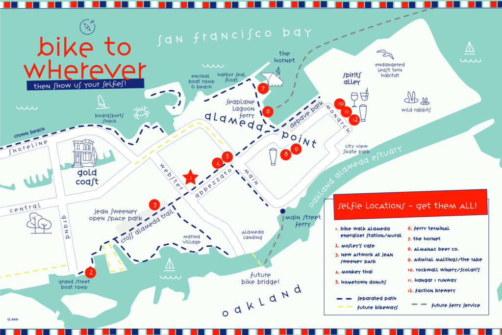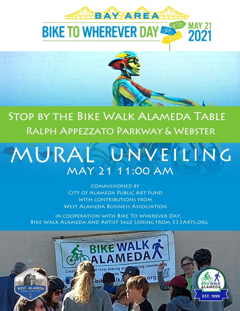 Join the free-spirited fun of ‘Bike To Wherever Day’ on May 21st. Start by visiting our table at the Cross Alameda Trail Plaza on the corner of Webster and Ralph Appezzato Memorial Parkway. We’ll be there from 8:00 a.m. to 2:00 p.m. with bike bags and ride suggestions. At 11:00 a.m. there will be a ceremony celebrating the bicyclist mural at the Plaza, sponsored by the West Alameda Business Association. Once you’ve ridden around the island, you can stop by Alameda Bicycle on Park Street and check out the booth there from 3:00 to 6:00 p.m. If you missed a bike bag at the CAT Plaza, you can pick one up at Alameda Bicycle. Join us! It will be the perfect day to play hooky—we deserve it! Follow the event on our Facebook page.