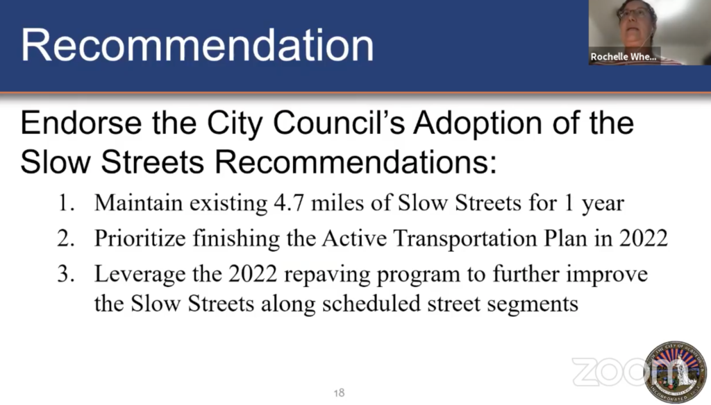 At a high level, staff’s recommendations were to: 1. maintain the existing 4.7 miles of Slow Streets for another year, 2. prioritize finishing the Active Transportation Plan (ATP), and 3. leverage the repaving plan to improve select sections of Slow Streets.