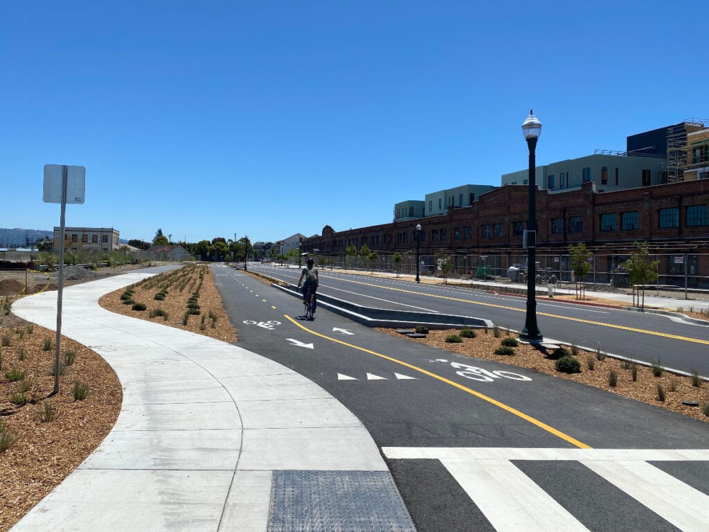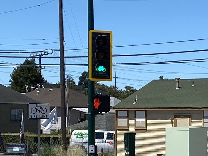The Cross Alameda Trail behind Del Monte is now completely open! The intersection just east of Jean Sweeney Open Space Park is not quite done yet, but it’s pretty exciting to see Alameda’s second bike signal in place.