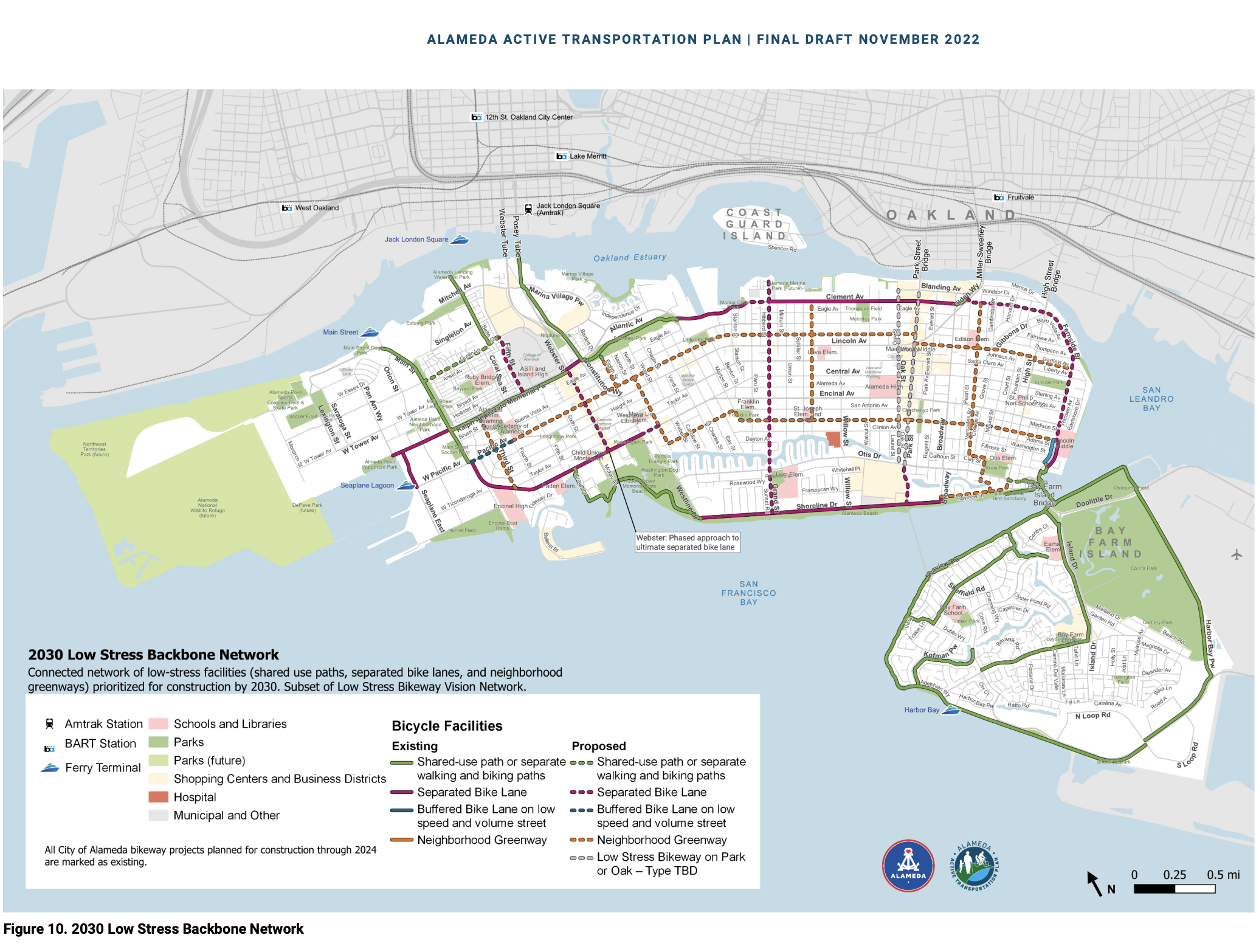 The ATP calls for converting all Slow Streets (Pacific, Versailles, San Jose) to Neighborhood Greenways first, in 2024, then building the remainder in 2025. However, the city is now proposing to delay implementation. Bike Walk Alameda is urging the city to proceed without delay, because these streets are so important. Neighborhood Greenways — and the Low Stress Network they’ll stitch together — will offer thousands of Alamedans a way to be less car-dependent, to safely get around town in a way that’s healthy, inexpensive, green, and fun. They’ll offer kids independence, and return time back to parents who no longer will have to chauffeur their kids around.