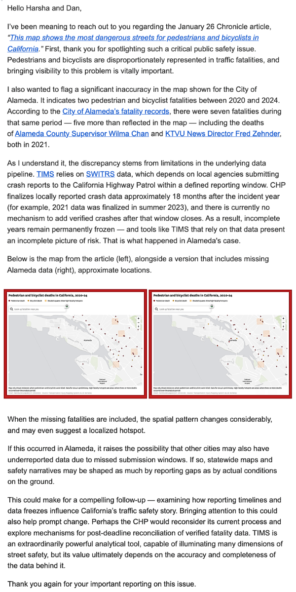 To raise awareness about this inaccuracy — and perhaps initiate a fix — Bike Walk Alameda wrote a letter to the article’s author and editor (click to expand):