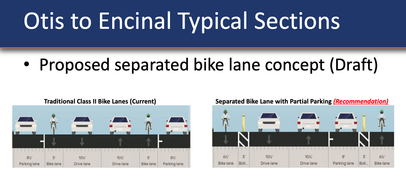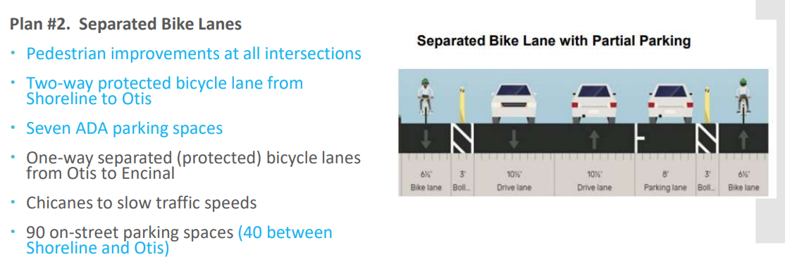 - Shore Line to Otis: 2-way cycle track along east side, and improvements as proposed in staff report