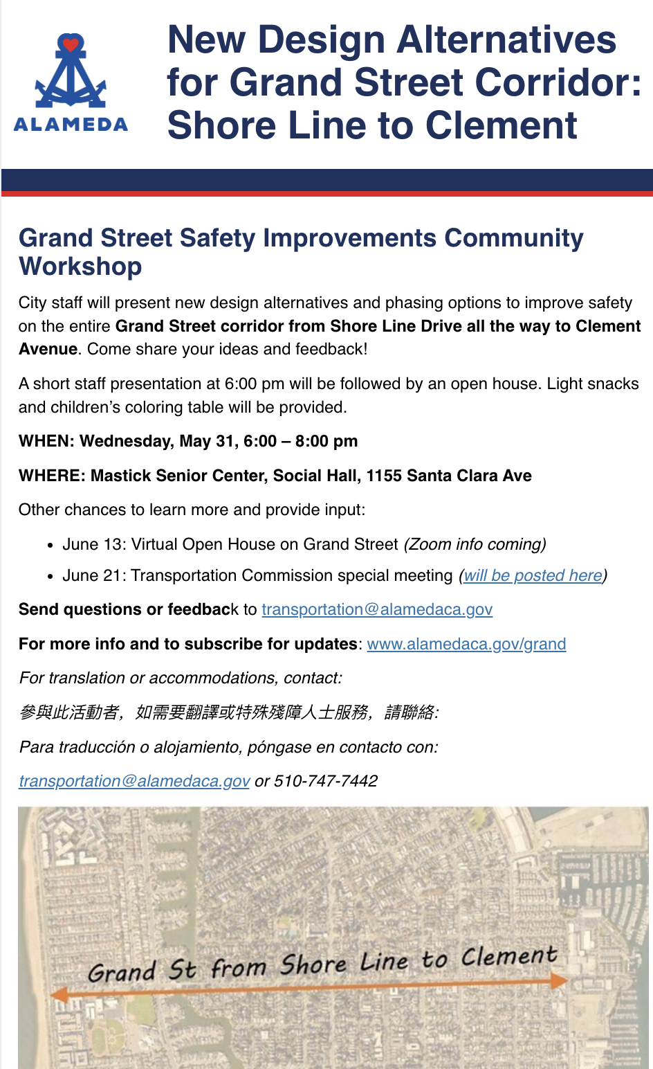 Grand Street is one of Alameda’s most important streets: it’s a critical north-south connector; it’s a key link in our low stress network, which is important for safety and greenhouse gas emission reductions; it’s a key school access route; and it’s a High Injury Corridor per city, county, and regional metrics. We’re eager to see safety for all of its users improved as expeditiously as possible — every day counts.