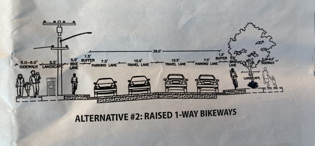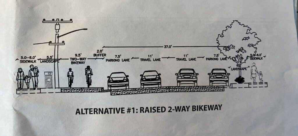 At its June 21 meeting, the Transportation Commission voted unanimously in favor of staff’s recommendation of Alternative 1, the raised 2-way bikeway on the east side of the street, for Segments B and C. Here’s a photo-realistic rendering of that design, looking south: