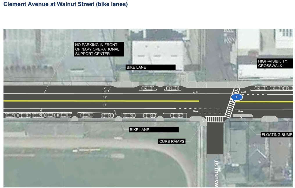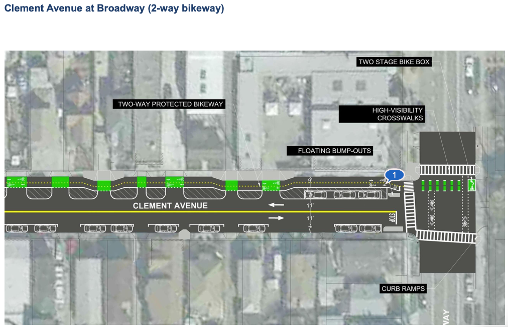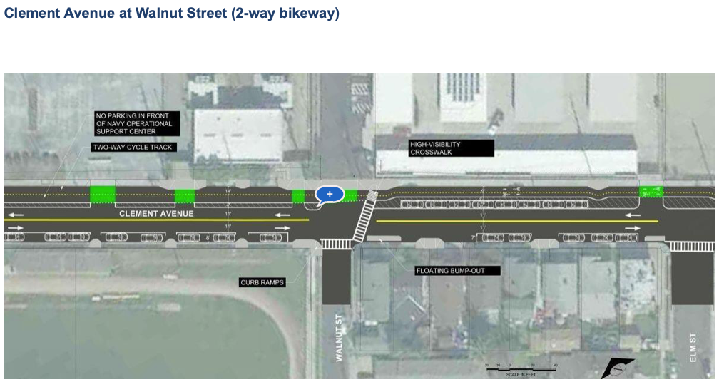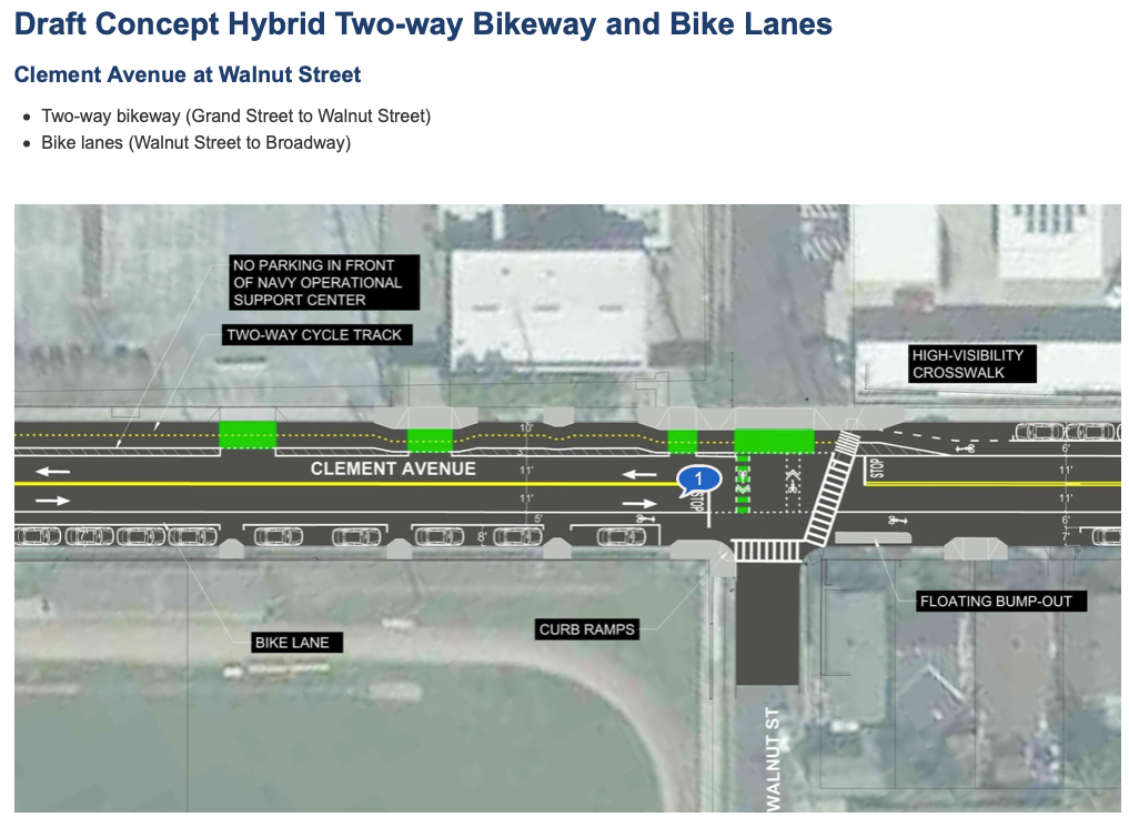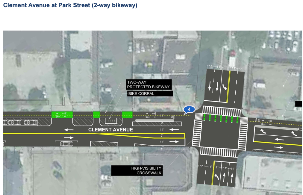 The most valid reason why protected bike lanes were not included in the plan was the need to leave over 20′ of street space for wide boats that are periodically transported on Clement Ave. At the time of the Transportation Commission vote, alternatives were not considered. We have some alternatives: