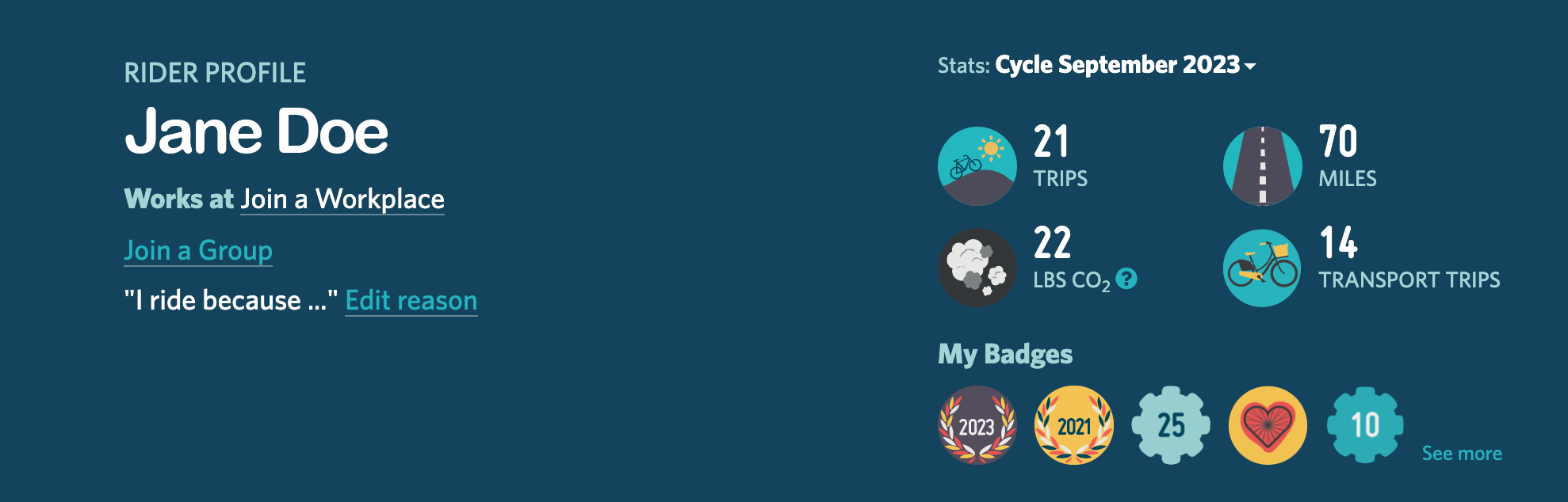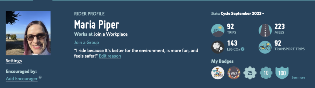 If you want to edit trip purpose through the mobile app, select “Rides” section at the bottom (bike icon) — select the ride, click the blue hamburger menu, choose “Change Trip Purpose”, and choose the closest option. To view your dashboard, select “More” from the bottom menu, choose “My Profile,” “Visit your profile,” and from that page, choose “Cycle September 2023” from the Stats drop-down menu.