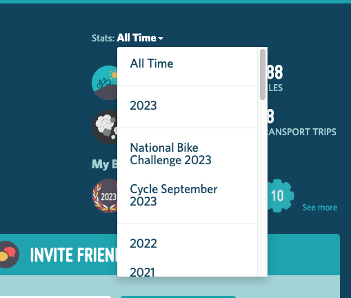 You can find your own dashboard through the mobile app on your phone or from a computer, but the computer option is a bit easier. Log in, and click on your user profile (your name, on the upper right side of the web page). Once there, you’ll see your personal dashboard, and to see Cycle September stats, you’ll need to select it from the “Stats” drop down on the right hand side of the dashboard: