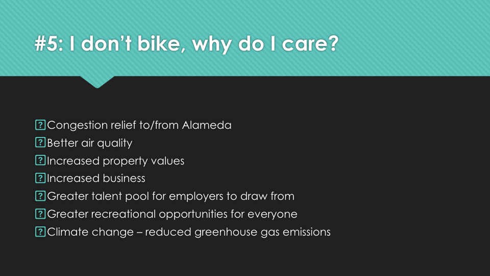 The International Council for Local Environmental Initiatives (ICLEI) issued a Baseline Greenhouse Gas Emissions Inventory Report for the City of Alameda in January 2007, which indicated that 53% of Alameda’s emissions come from transportation sources. The good news is, bicycling and walking have ZERO emissions!